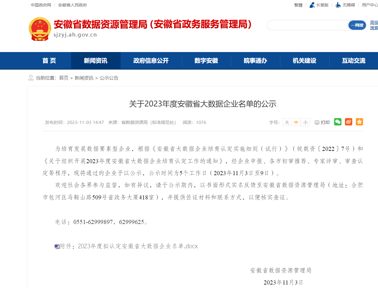 2023年11月3日,,,,安徽省数据资源管理局正式公布2023年度安徽省大数据企业名单,,根据《安徽省大数据企业培育认定实施细则(试行)》(皖数资〔2022〕7号)和《关于组织开展2023年度安徽省大数据企业培育认定工作的通知》,,,,经过严格的评估确认,,安徽尊龙时凯科技有限公司成功入选!!